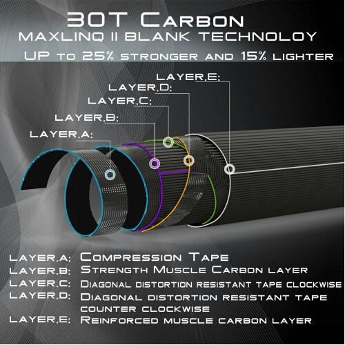 EXCLUSIVE MAXLINQ SERIES II BLANK TECHNOLOGY – Pure IM8 30T SK Carbon fiber. With mixed 5 layers of carbon including Reinforced Muscle carbon layer for at least 25% increase in strength but 15% lighter in weight.