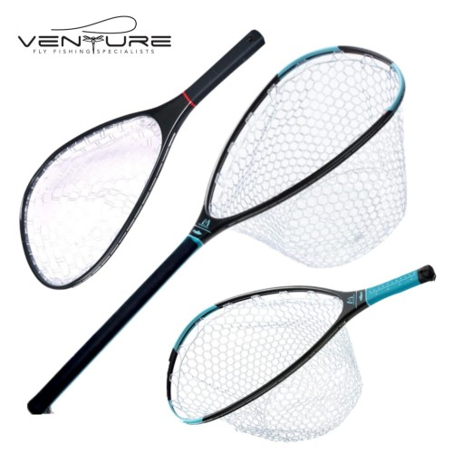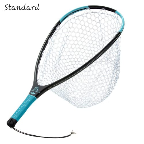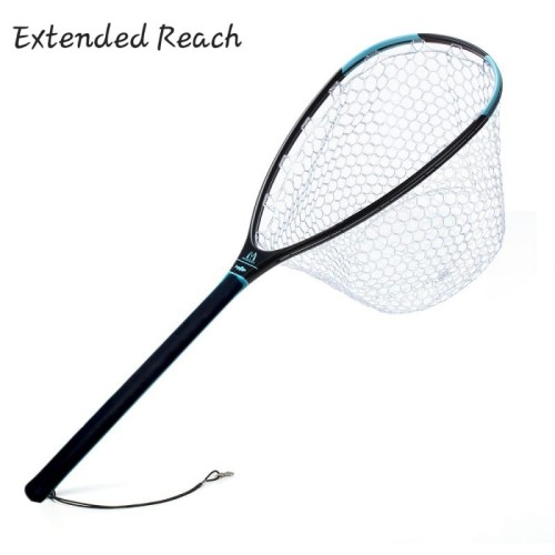 These are our high performance style landing nets, they come in a traditional shaped frame and in two sizes. All of our graphite nets come with a monofilament clear rubber net. These nets are our recommended trout catch and release nets as they are less abrasive and hook friendly. Includes elastic lanyard with clip closure for securing to your fly vest or belt loop. The Maxcatch Teal Landing Nets comes with measurement points so you're able to measure your fish. The Extended Reach Carbon Teal net measures a total length of 95cm.