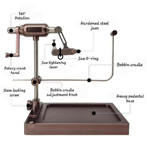 The Venture 'Rotar Actuator' Fly Tying Vice is a must have addition for your fly tying station. Featuring a strong and stable design weighting in at an impressive 1,27kgs. This vice is a dependable, durable and fully adjustable workhorse that will faithfully fulfill all of your fly tying needs for years to come. Finished in an anodized Brass colour the Venture Rotar Actuator Vice is the choice for seasoned fly tiers, giving you and your bobbin the room to work your magic.